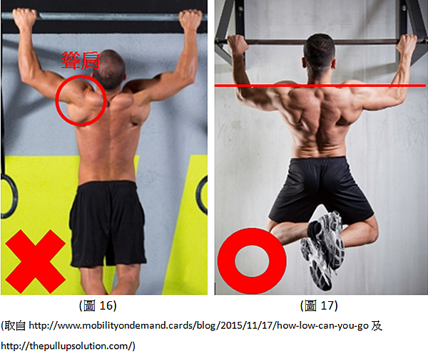 例如在做引體向上時,要像(圖17)肩膀平的,脖子會有往上延伸的感覺,而不是(圖16)聳肩,脖子往內縮的樣子。