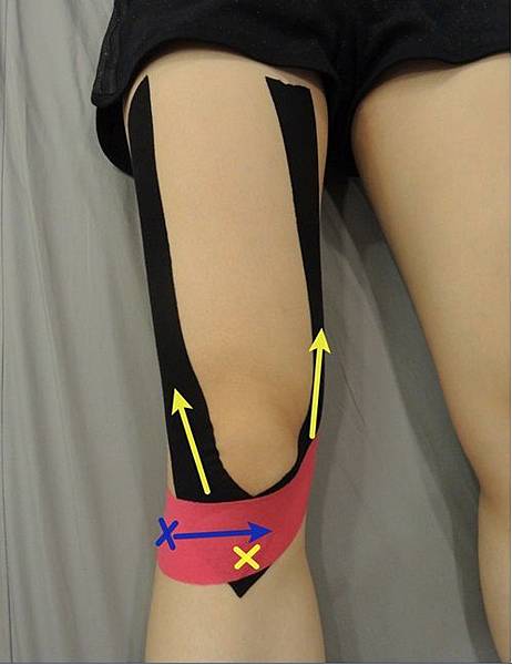 而肌內效貼布的貼紮在於將髕骨往上提起,降低髕骨韌帶上的壓力,以及固定住髕骨韌帶的沾黏處。